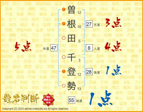 曽(12画)根(10画)田(5画) 千(3画)登(12画)勢(13画)