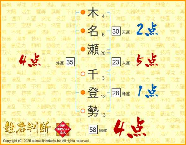 木(4画)名(6画)瀬(20画) 千(3画)登(12画)勢(13画)