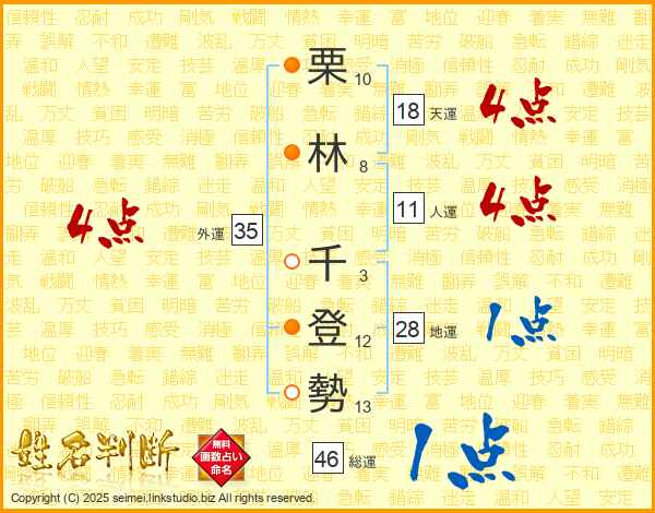 栗(10画)林(8画) 千(3画)登(12画)勢(13画)