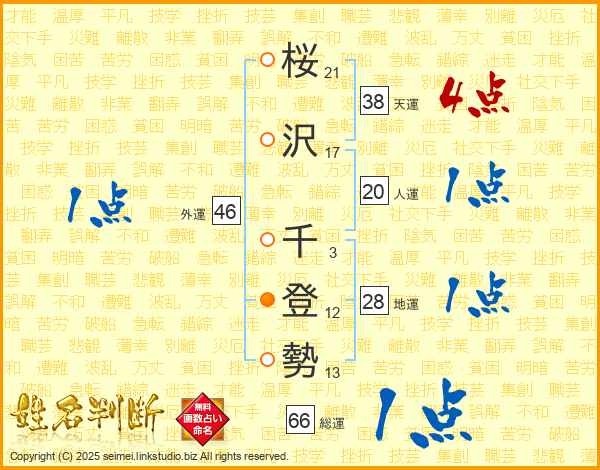 桜(21画)沢(17画) 千(3画)登(12画)勢(13画)