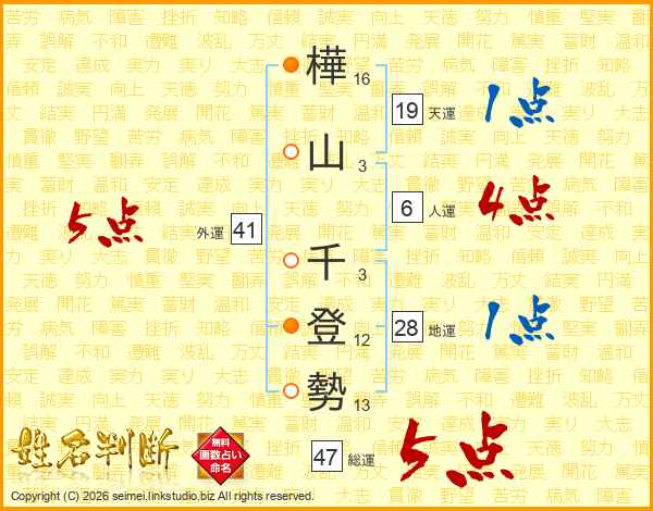 樺(16画)山(3画) 千(3画)登(12画)勢(13画)
