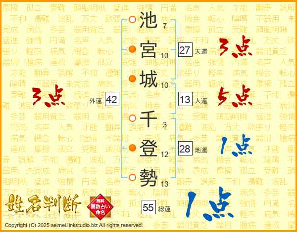 池(7画)宮(10画)城(10画) 千(3画)登(12画)勢(13画)