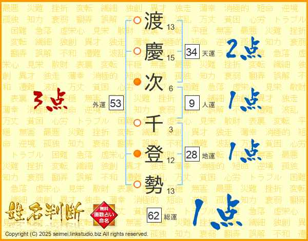 渡(13画)慶(15画)次(6画) 千(3画)登(12画)勢(13画)