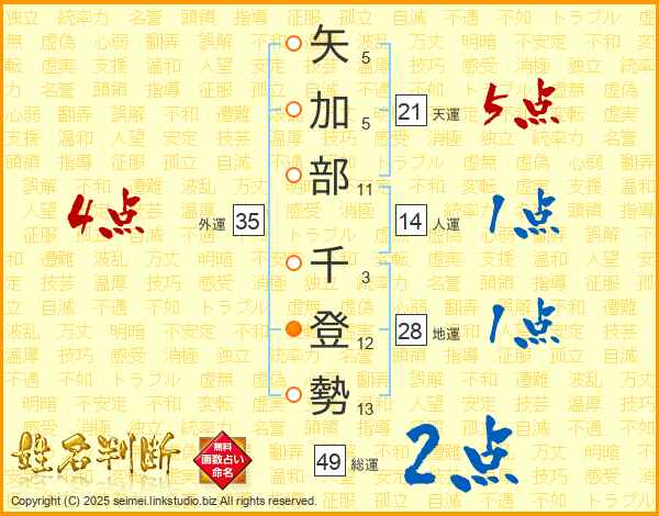 矢加部千登勢さんの総運は49画の2点!