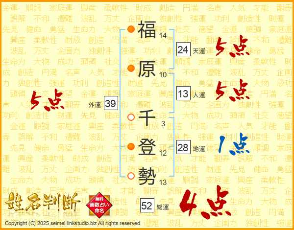 福(14画)原(10画) 千(3画)登(12画)勢(13画)