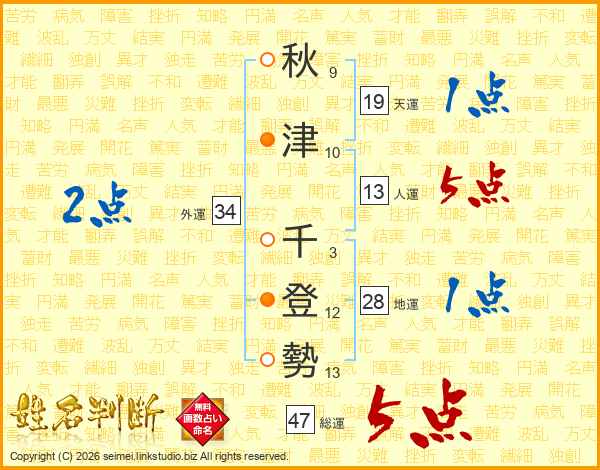 秋(9画)津(10画) 千(3画)登(12画)勢(13画)