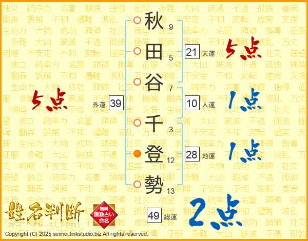 秋(9画)田(5画)谷(7画) 千(3画)登(12画)勢(13画)
