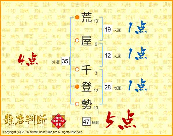 荒屋千登勢さんの総運は47画の5点!