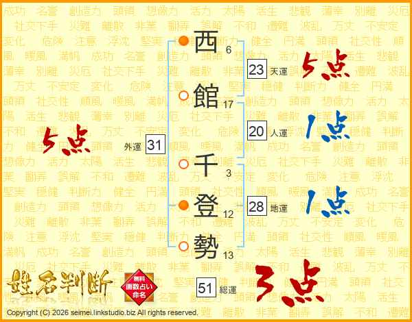 西(6画)館(17画) 千(3画)登(12画)勢(13画)