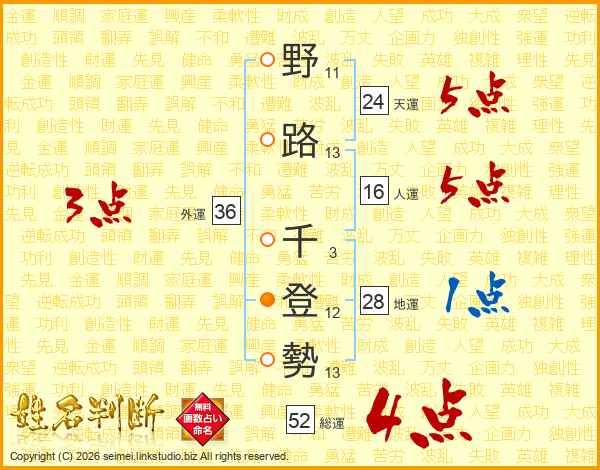 野(11画)路(13画) 千(3画)登(12画)勢(13画)