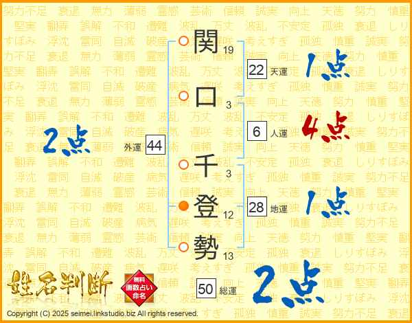 関(19画)口(3画) 千(3画)登(12画)勢(13画)