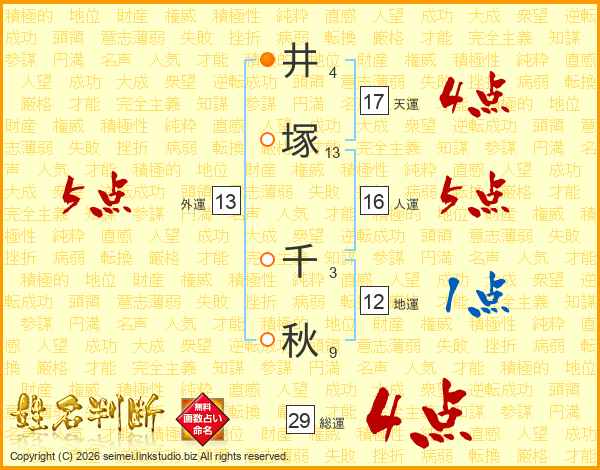井(4画)塚(13画) 千(3画)秋(9画)