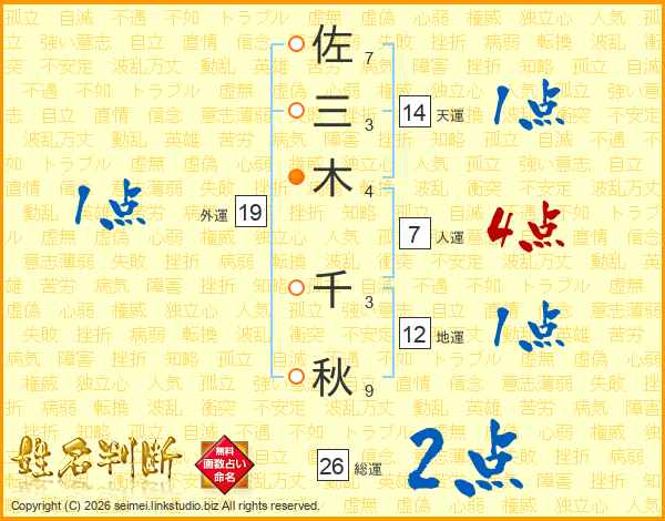 佐(7画)三(3画)木(4画) 千(3画)秋(9画)