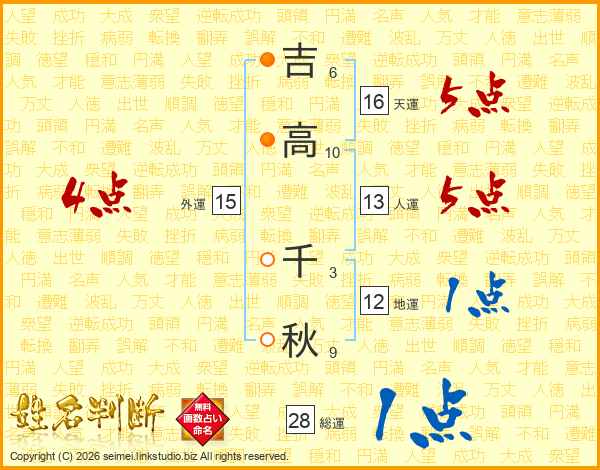 あなたの人生を表す1番重要な運勢です。生涯を通じて影響する総合運となり、主に50歳以降の晩年期に影響を及ぼします。苗字と名前の合計画数。