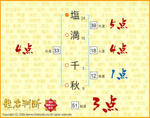 塩(24画)満(15画) 千(3画)秋(9画)