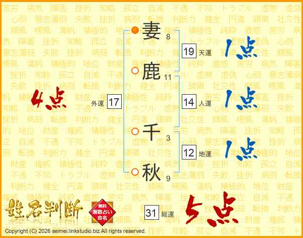 妻鹿千秋さんの総運は31画の5点!