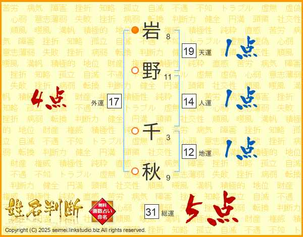 生活面を象徴する運勢です。外部から受ける影響力を表し、結婚運、家庭運や職場、環境への順応性を表します。総運から人運を引いた画数。姓や名が1文字の場合を除く。