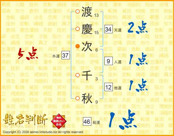 渡(13画)慶(15画)次(6画) 千(3画)秋(9画)