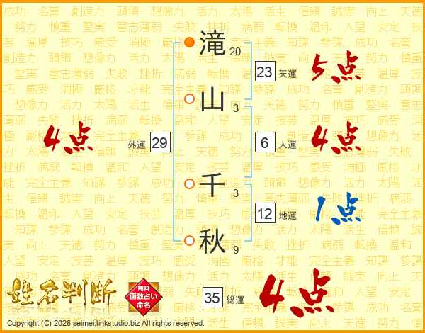 滝(20画)山(3画) 千(3画)秋(9画)