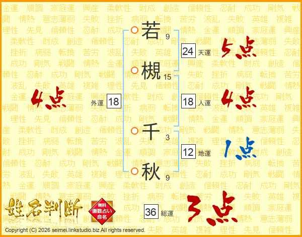 若(9画)槻(15画) 千(3画)秋(9画)