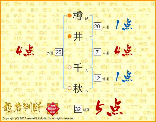 樽井千秋さんの総運は32画の5点!