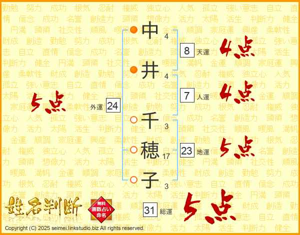 中(4画)井(4画) 千(3画)穂(17画)子(3画)