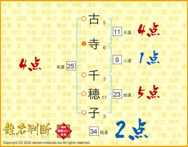 古(5画)寺(6画) 千(3画)穂(17画)子(3画)