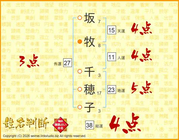 坂(7画)牧(8画) 千(3画)穂(17画)子(3画)