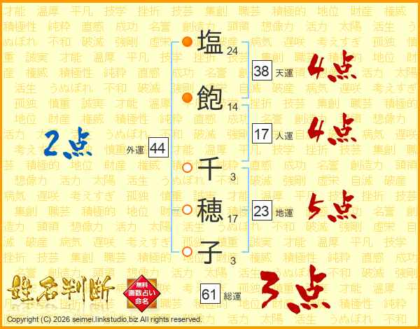 塩飽千穂子さんの総運は61画の3点!