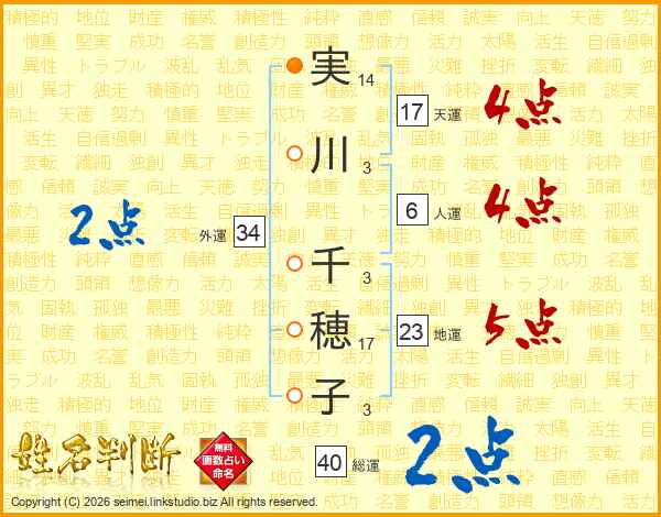 実(14画)川(3画) 千(3画)穂(17画)子(3画)
