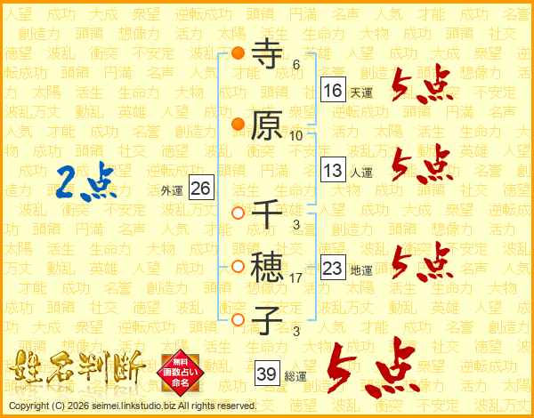 寺原千穂子さんの総運は39画の5点!