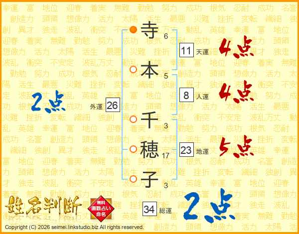 寺(6画)本(5画) 千(3画)穂(17画)子(3画)