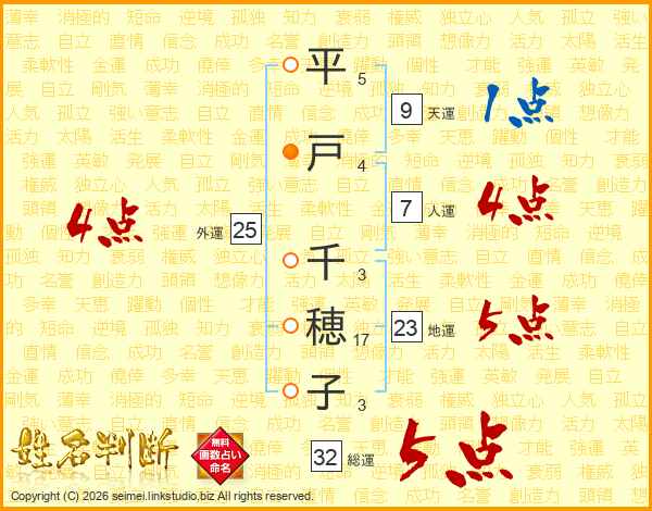平(5画)戸(4画) 千(3画)穂(17画)子(3画)