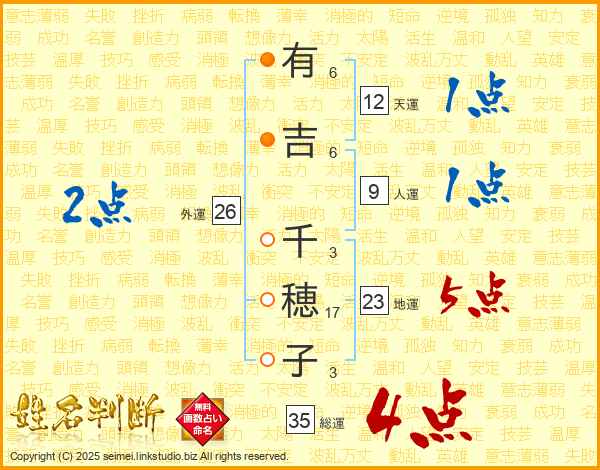 有(6画)吉(6画) 千(3画)穂(17画)子(3画)