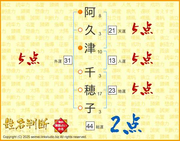 阿(8画)久(3画)津(10画) 千(3画)穂(17画)子(3画)