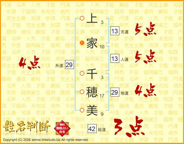 上家千穂美さんの人運は13画の5点!