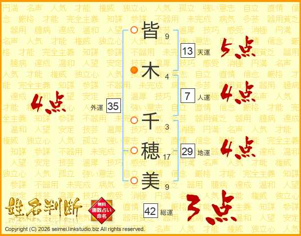皆(9画)木(4画) 千(3画)穂(17画)美(9画)