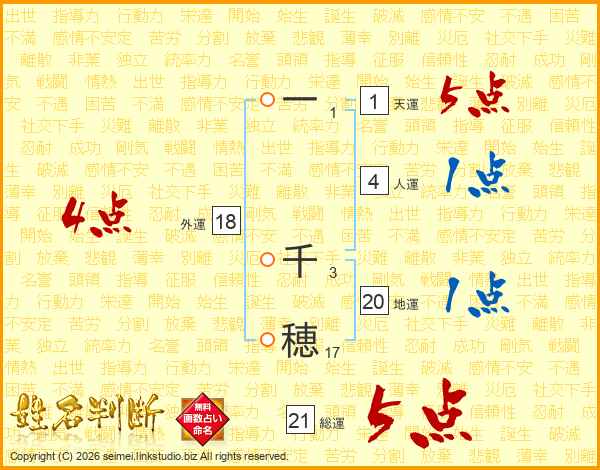 生活面を象徴する運勢です。外部から受ける影響力を表し、結婚運、家庭運や職場、環境への順応性を表します。総運から人運を引いた画数。姓や名が1文字の場合を除く。