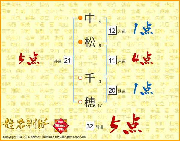 生活面を象徴する運勢です。外部から受ける影響力を表し、結婚運、家庭運や職場、環境への順応性を表します。総運から人運を引いた画数。姓や名が1文字の場合を除く。