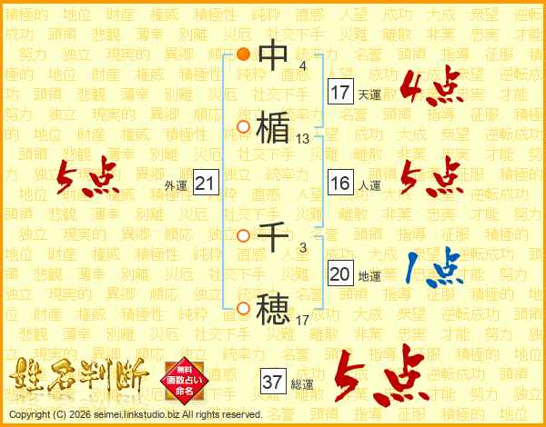 生活面を象徴する運勢です。外部から受ける影響力を表し、結婚運、家庭運や職場、環境への順応性を表します。総運から人運を引いた画数。姓や名が1文字の場合を除く。