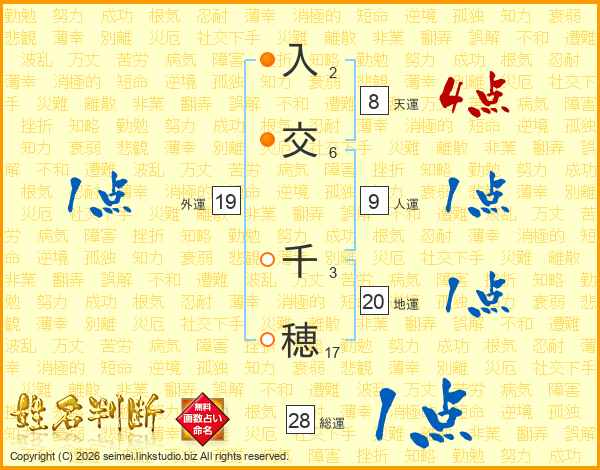 生活面を象徴する運勢です。外部から受ける影響力を表し、結婚運、家庭運や職場、環境への順応性を表します。総運から人運を引いた画数。姓や名が1文字の場合を除く。