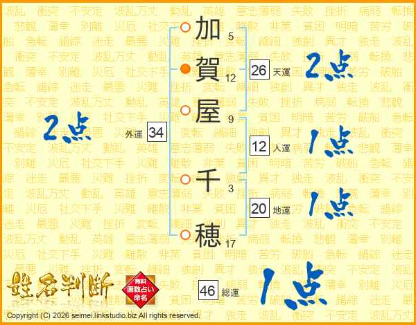加(5画)賀(12画)屋(9画) 千(3画)穂(17画)