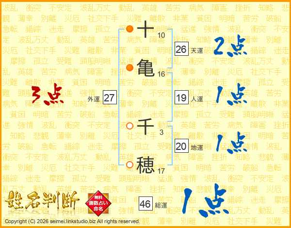 十(10画)亀(16画) 千(3画)穂(17画)