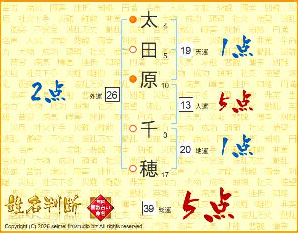 太(4画)田(5画)原(10画) 千(3画)穂(17画)