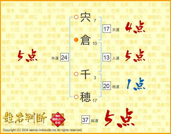 宍倉千穂さんの総運は37画の5点!
