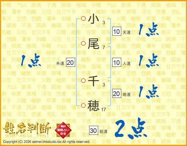 小(3画)尾(7画) 千(3画)穂(17画)