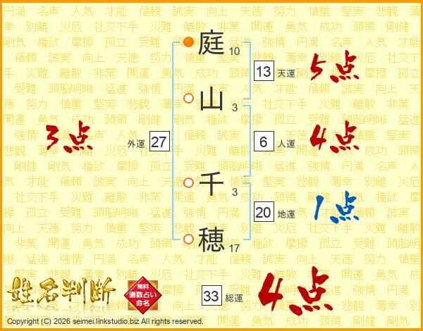 生活面を象徴する運勢です。外部から受ける影響力を表し、結婚運、家庭運や職場、環境への順応性を表します。総運から人運を引いた画数。姓や名が1文字の場合を除く。