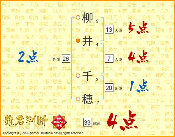 柳(9画)井(4画) 千(3画)穂(17画)