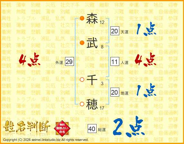 森(12画)武(8画) 千(3画)穂(17画)