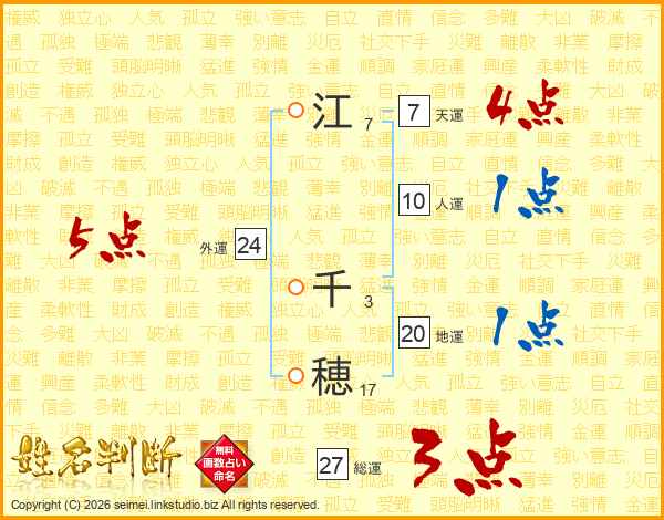 生活面を象徴する運勢です。外部から受ける影響力を表し、結婚運、家庭運や職場、環境への順応性を表します。総運から人運を引いた画数。姓や名が1文字の場合を除く。